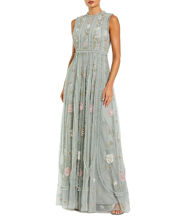 Mac Duggal Beaded Mesh High Neck Micro Ruffle Floral Overlay Column Gown