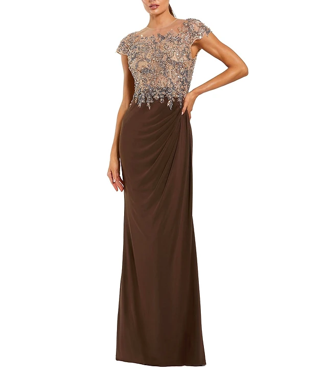 Mac Duggal Embellished Beading Cap Sleeve Embroidered A-Line Gown