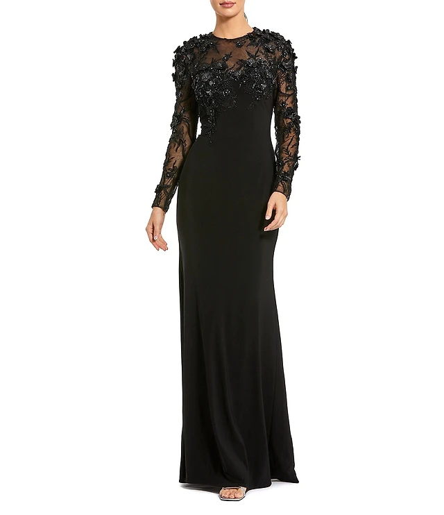 Mac Duggal Floral Beaded Mesh Long Illusion Sleeve A Line Gown