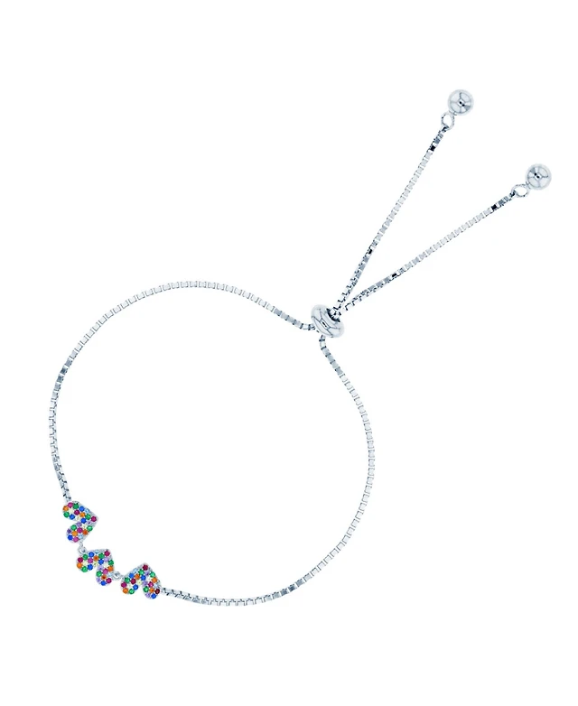 Rainbow Cubic Zirconia Pave Triple Heart Bolo Bracelet Sterling Silver (Also 14k Gold Over Silver)