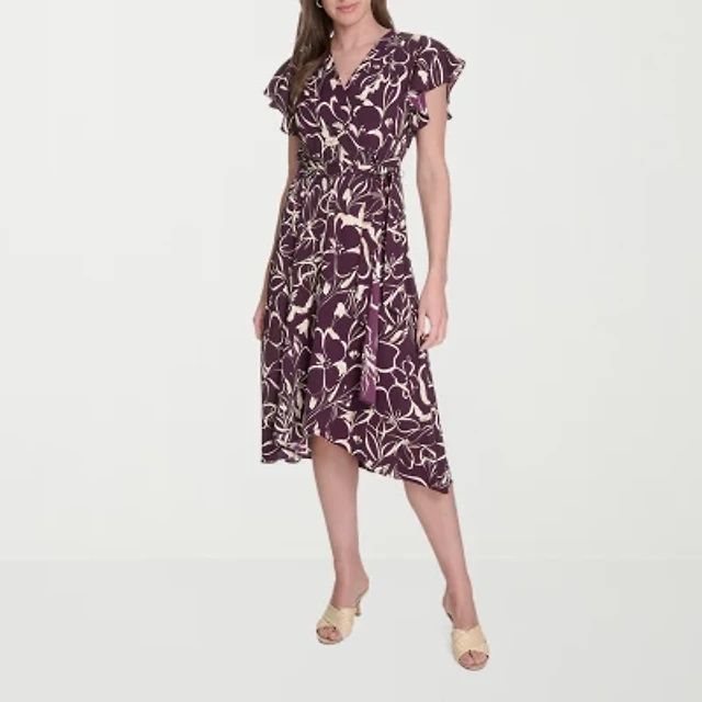 Marc New York Womens Short Sleeve Floral Midi Fit + Flare Dress