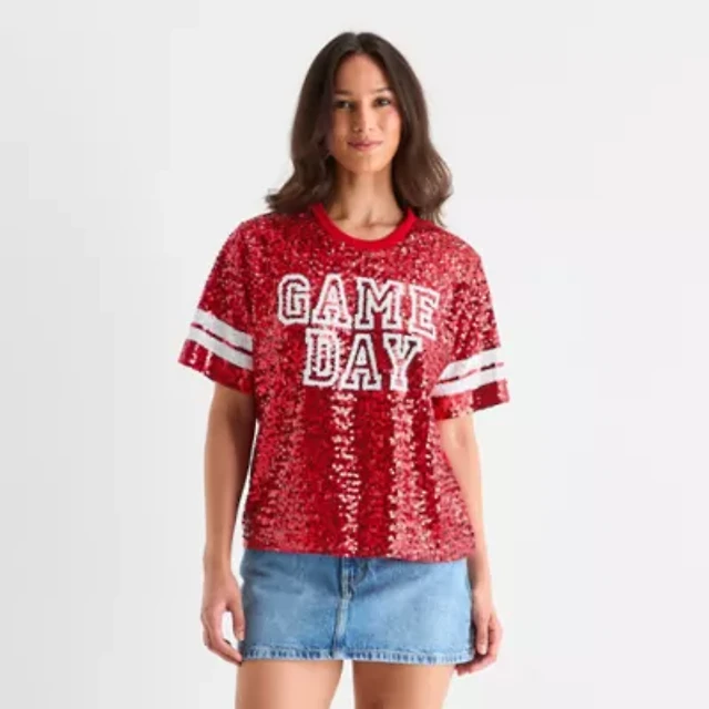 Gameday Sequin Womens Juniors Crew Neck Short Sleeve Regular Fit Graphic T-Shirt