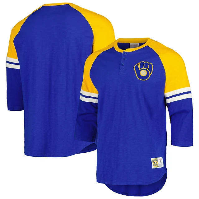 Men's Mitchell & Ness Royal Milwaukee Brewers Cooperstown Collection Legendary Raglan Slub Henley 3/4-Sleeve T-Shirt