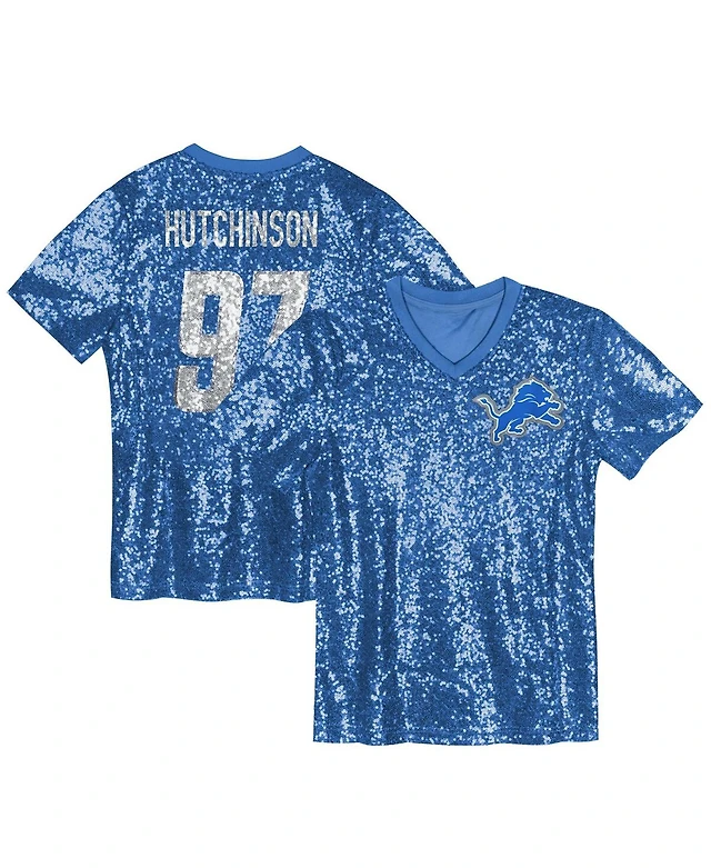 Outerstuff Big Girls Aidan Hutchinson Blue Detroit Lions Sequin V-Neck Fashion Jersey