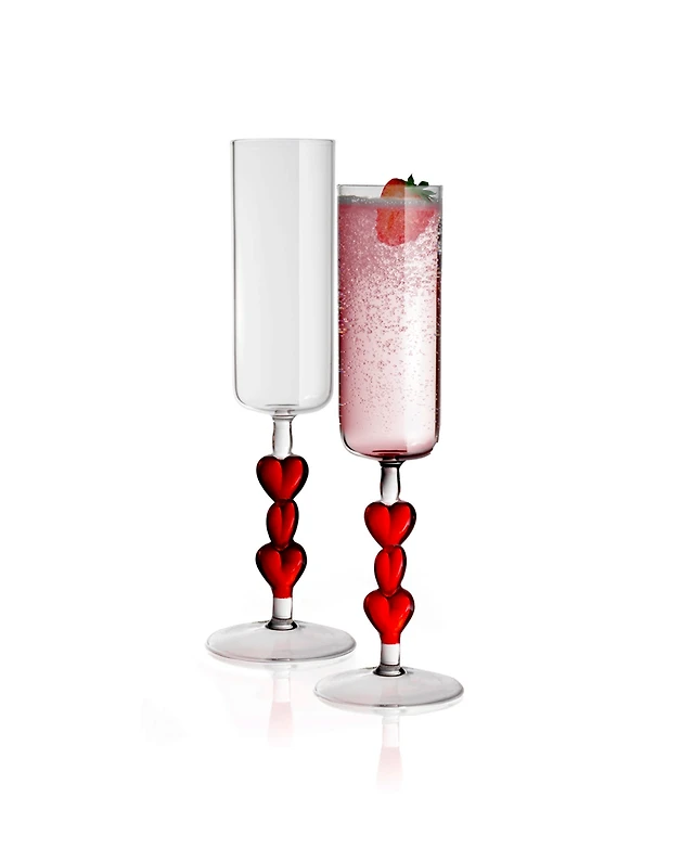 Qualia Glass Red Heart Stemmed Champagne Flute Glasses, Set of 2