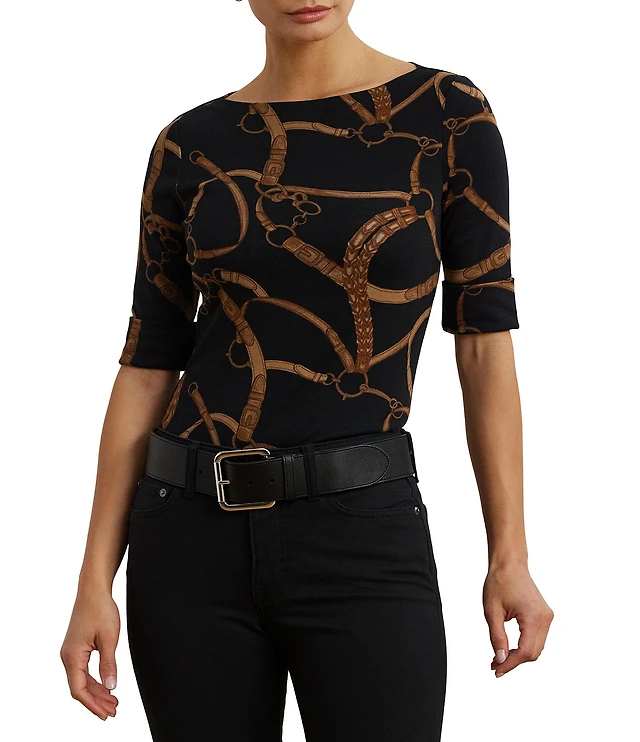 Lauren Ralph Lauren Belting Print Boat Neck Elbow Sleeve Fitted Tee