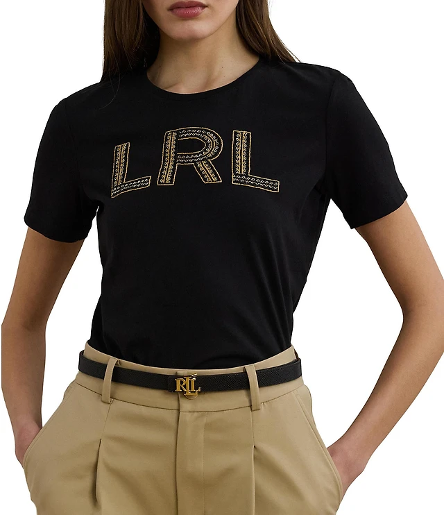 Lauren Ralph Lauren Petite Size Soft Jersey Cotton Crew Neck Short Sleeve Beaded Logo Tee