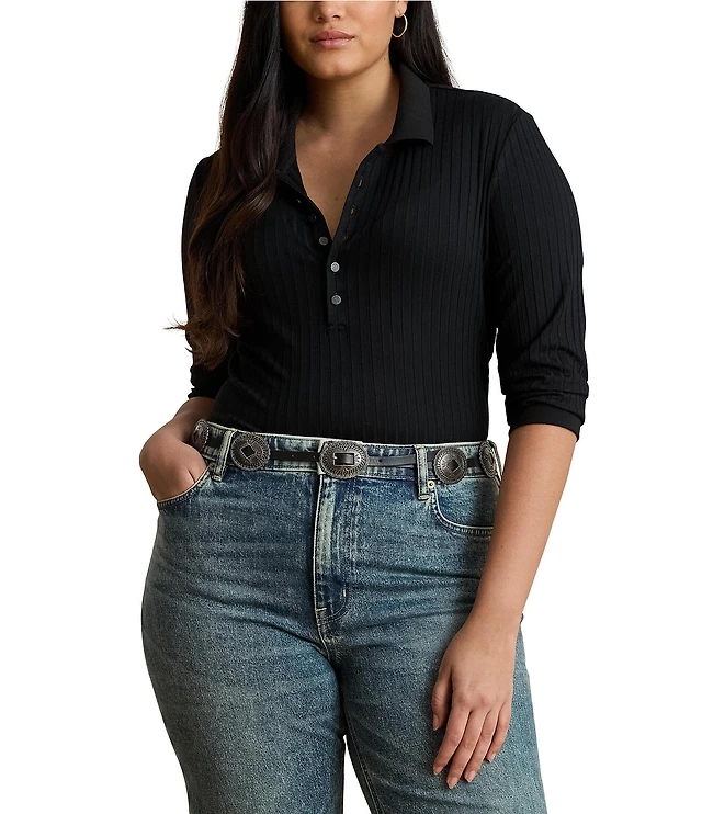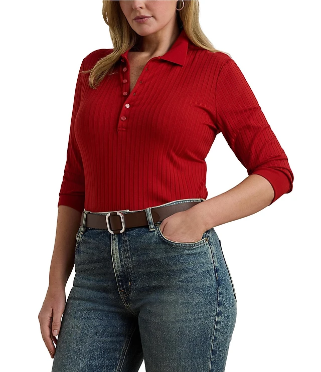 Lauren Ralph Lauren Plus Size Rib-Knit Polo Collar 3/4 Sleeve Shirt