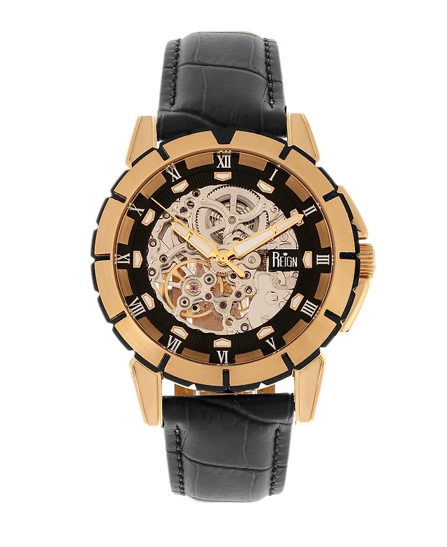 Reign Philippe Automatic Rose Gold Case, Black Dial, Genuine Black Leather Watch 41mm