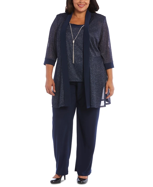 R & M Richards Plus 3-Pc. Metallic Jacket, Necklace Top Pants Set