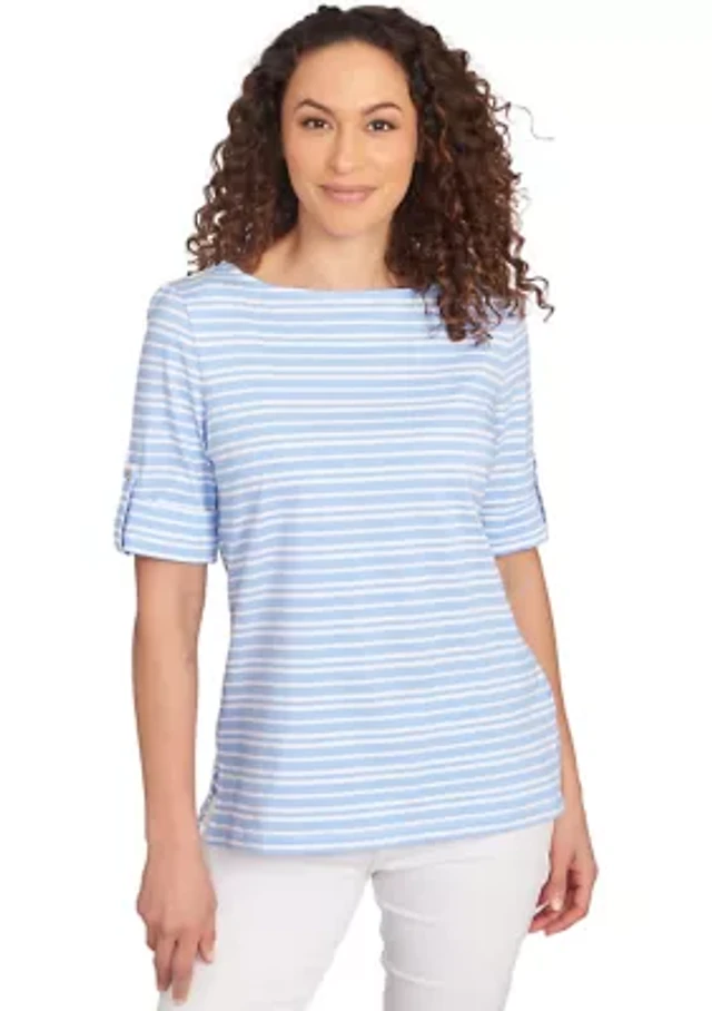 Petite Envelope Neck Multi Paisley Printed Knit Top with Ladder Detail Short Sleeves