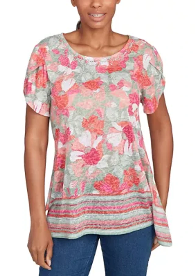 Plus Scoop Neck Floral Placement Printed Knit Top with Asymmetric Hem