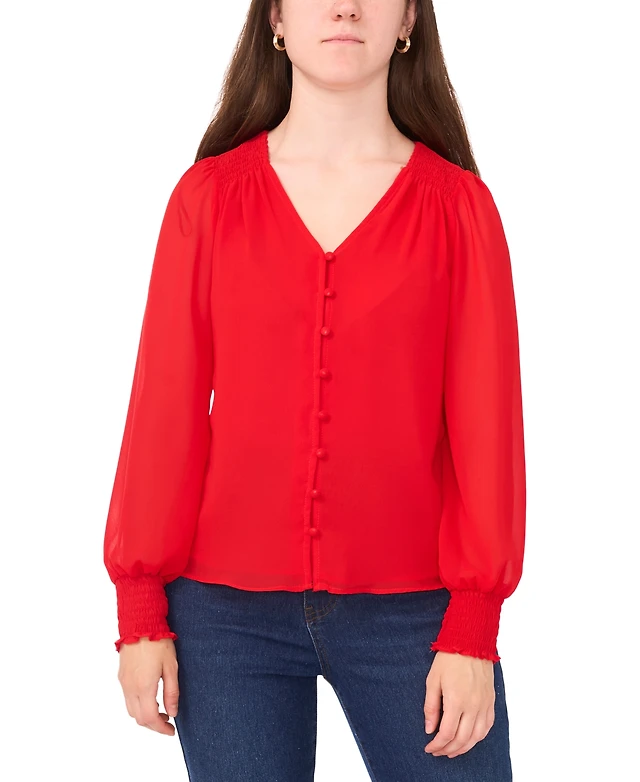 Sam & Jess Women's V-Neck Button-Front Smocked-Shoulder Top