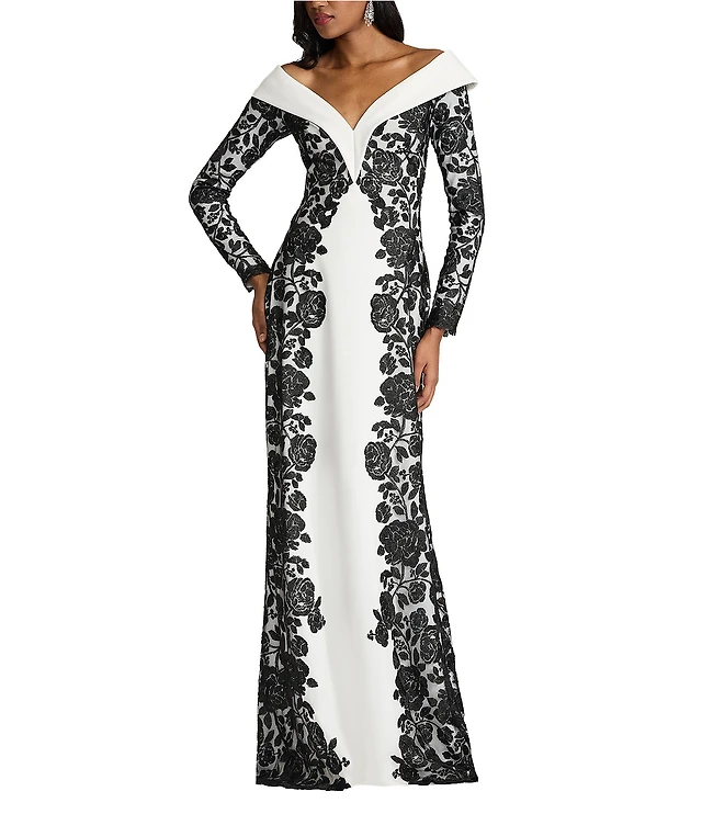 Tadashi Shoji Portrait Collar Long Sleeve Embroidered Lace Textured Crepe Gown