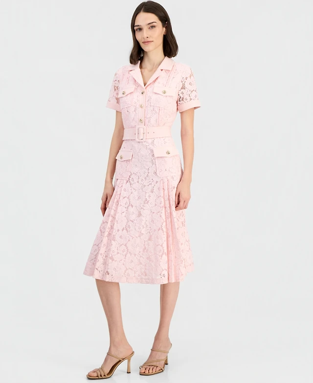 Tahari Asl Women's Belted Short-Sleeve Lace Midi Shirt Dress