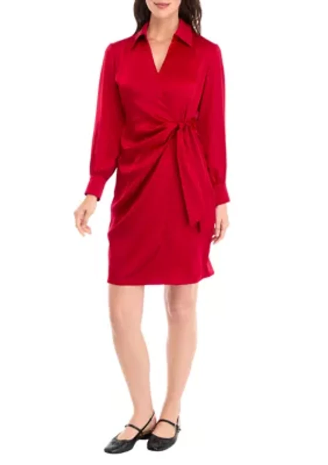 Petite Satin Button Front Long Sleeve Blouse