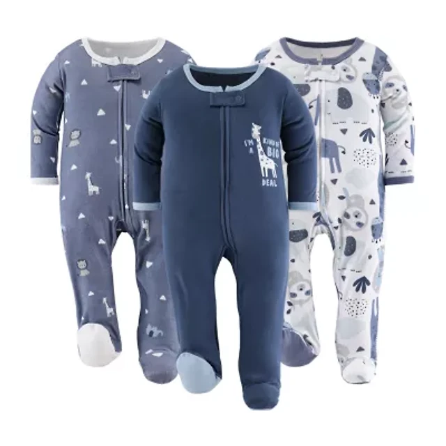 The Peanutshell Baby Boys Blue Safari Footed Sleepers for Boys, 3 Pack