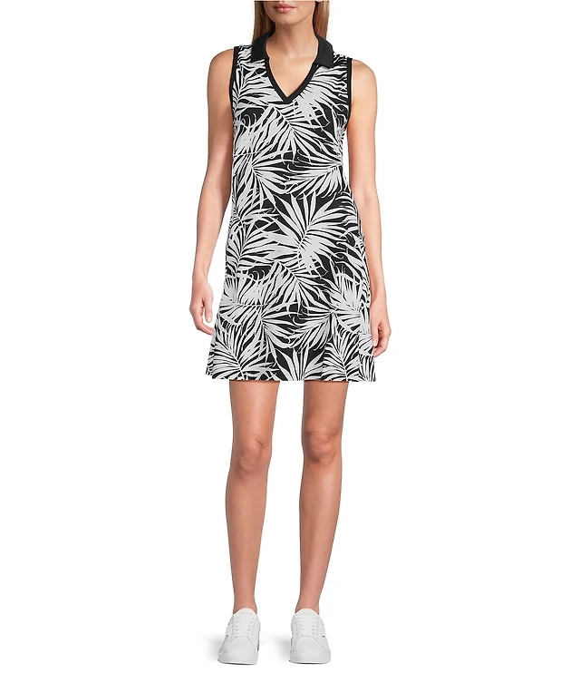 Aubrey Lorenzo IslandZone® Jersey Leaf Print Polo Collar Sleeveless A-Line Dress