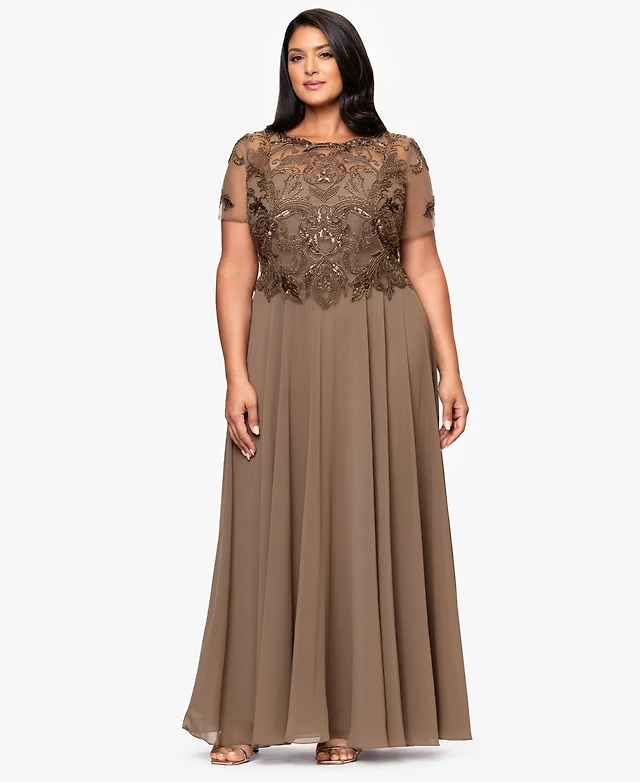 Xscape Plus Short-Sleeve V-Neck Long Dress