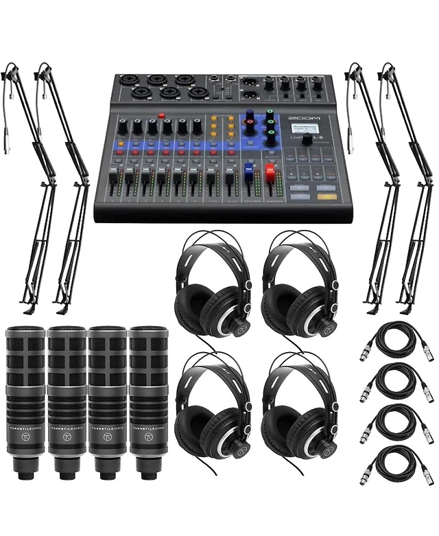 Zoom LiveTrak L-8 Mixer Bundle with 4x Rode Pod Mics with Desk Arm Stand, 4x Headphones, Includes Headphones