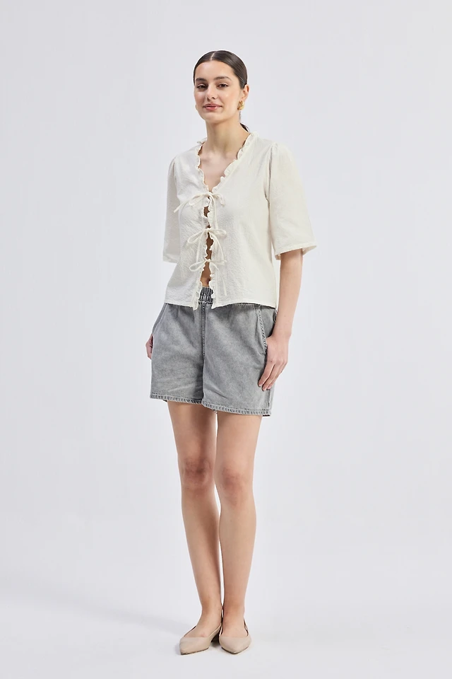 Reistor Women's Relaxed Fit Top With Ruffles and Front-Ties Cream