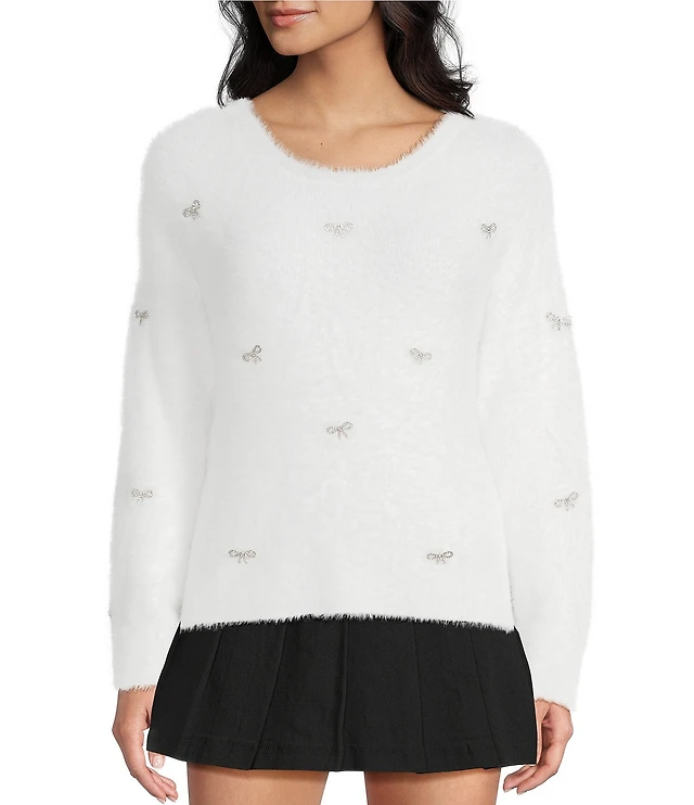 CeCe Round Neck Long Sleeve Embellished Bow Sweater