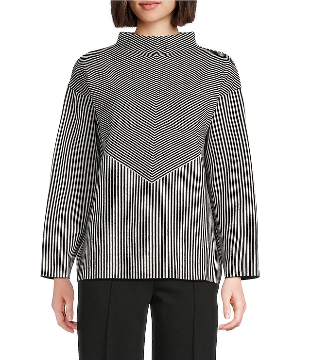 Ali Miles Jacquard Knit Abstract Stripe Split Cowl Zipper Neck Long Sleeve Pop-Over Sweater