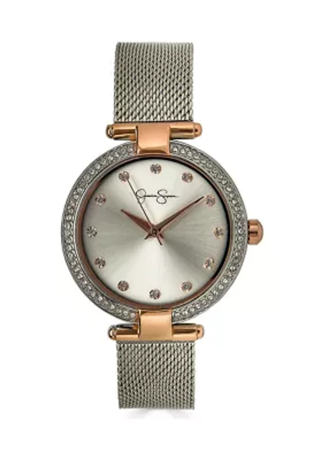 Silver Tone 36 Millimeter Crystal Textured Dial Mesh Watch