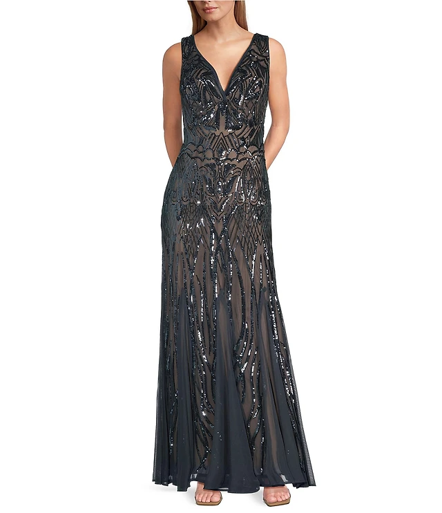 Morgan & Co. Pattern Sequin Cage Back Long Dress