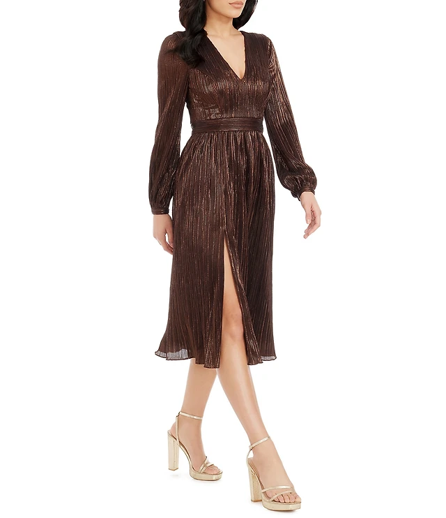Alex Marie Jenna Foiled Metallic High Boat Neck Long Blouson Sleeve Faux Wrap Ruched Asymmetrical Hem Midi Dress
