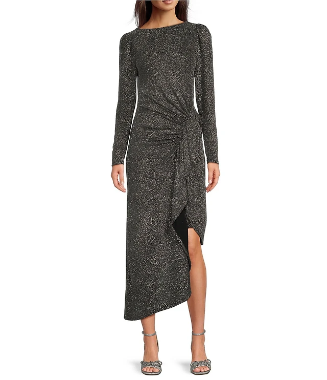 Tadashi Shoji V Neck Long Sleeve Metallic Jersey Ruffle Front Blouson Gown