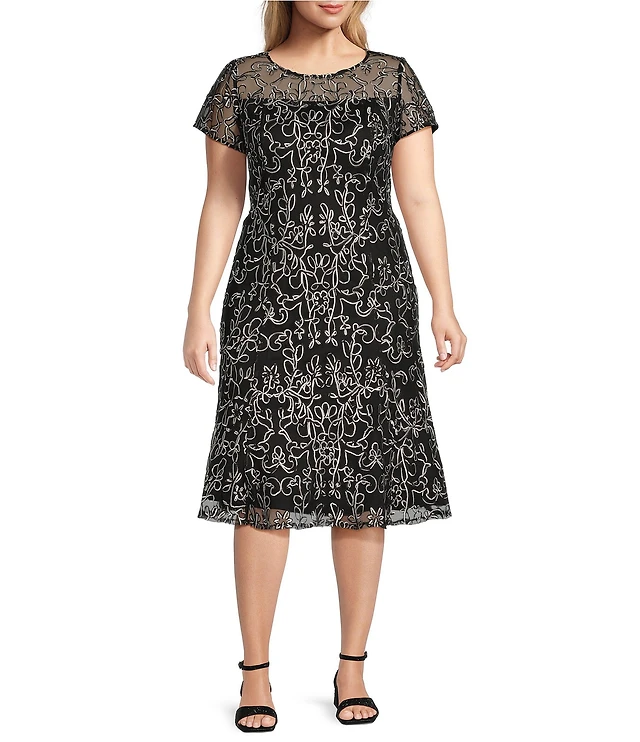 Ignite Evenings Plus Size Crew Neck Short Sleeve Embroidered Soutache Lace Illusion Midi Dress