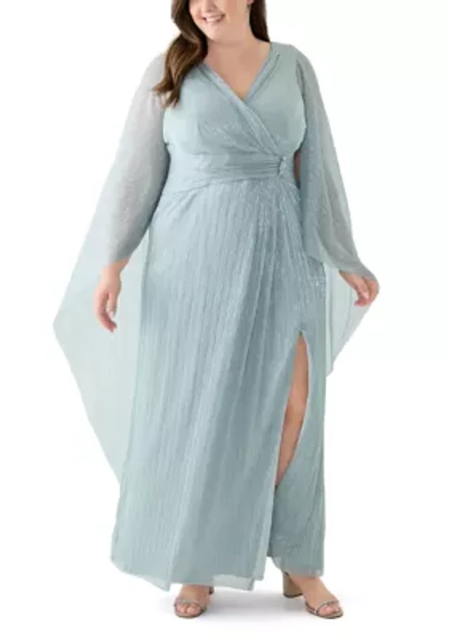 Plus Long Blouson Sleeve V-Neck Jacquard A-Line Dress