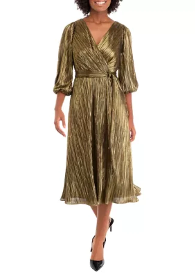 Women's 3/4 Puff Sleeve V-Neck Belted Fit and Flare Dress