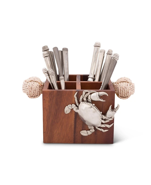 Vagabond House Caddy Square Acacia Wood Flatware, Serve Ware, Utensil, Carry-All Holder with Solid Pewter Crab Accent and Real Rope Handles, 4 Compart