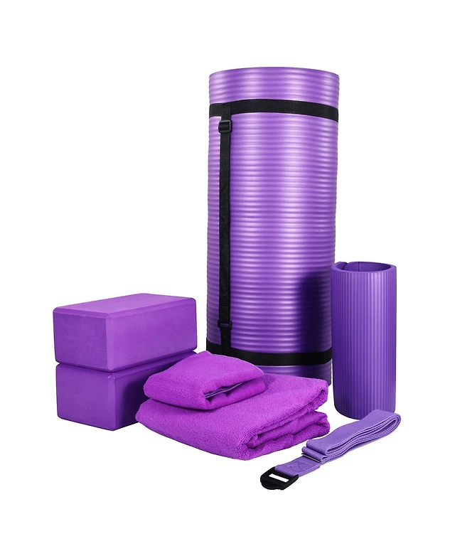 BalanceFrom Fitness 7 Piece Yoga Set with Mat, Stretch Strap, & Knee Pad, Purple