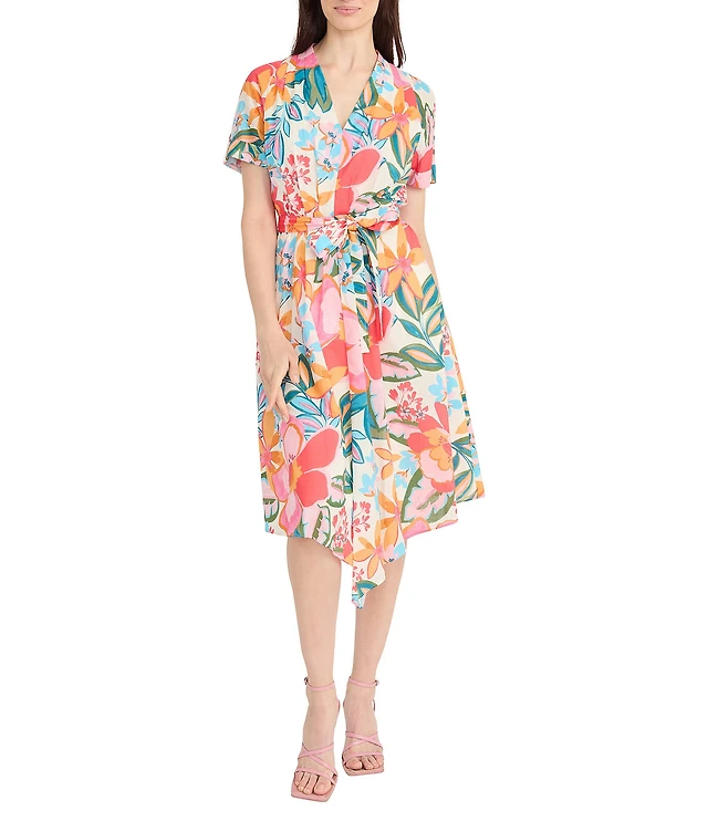 Maggy London V-Neck Short Sleeve Tie Waist Printed Cotton Voile Shirt Midi Dress