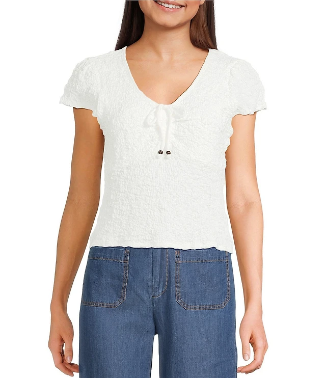 Figueroa & Flower Petite Size Woven Split V-Neck 3/4 Sleeve Lace Front Tie Top
