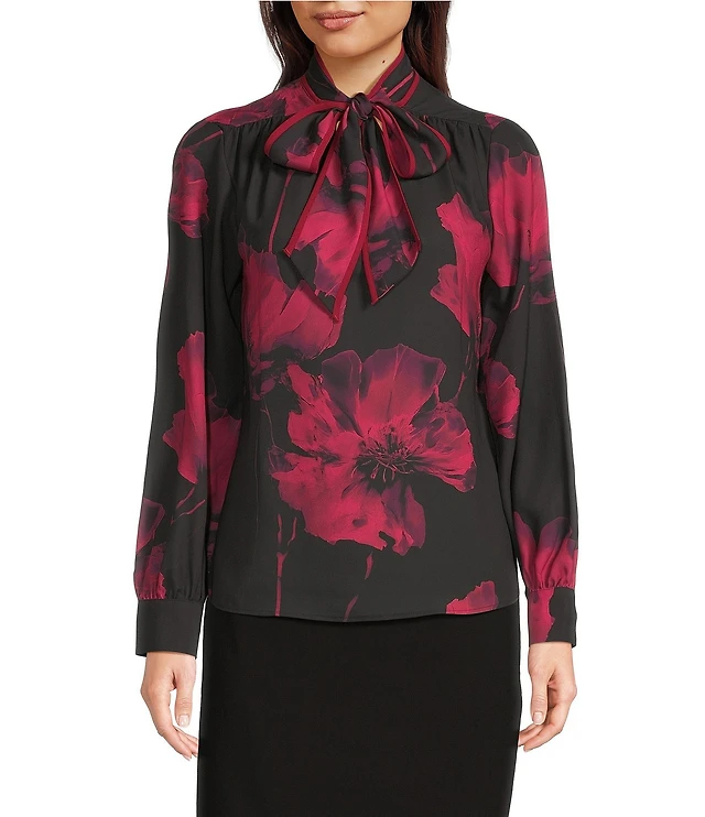 Karen Kane Satin Hydrangea Print Long Blouson Sleeve Tie-Front Top