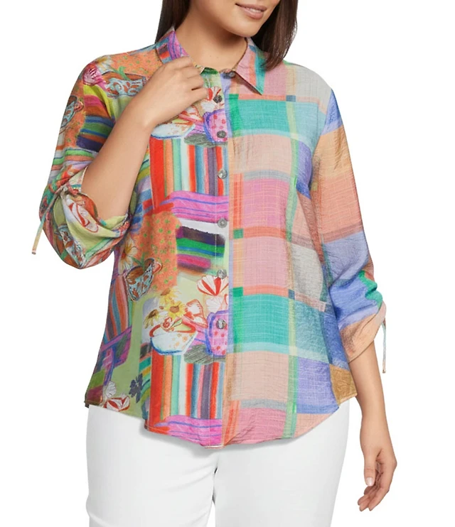 Calessa Petite Size Floral Embroidered Mosaic Patchwork Tassel Tie Round Split Neck 3/4 Sleeve Tunic