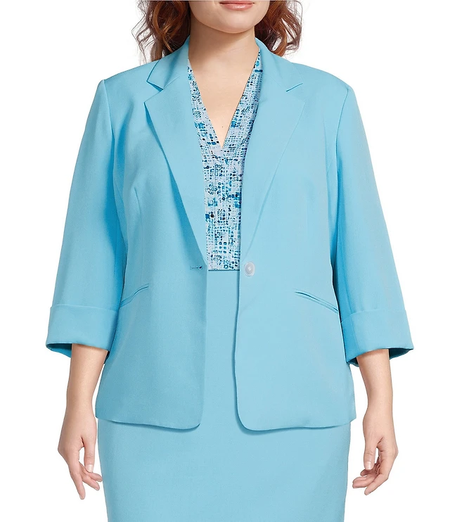 Investments Plus Size Scratch Pattern 3/4 Ruched Sleeve Notch Lapel Lined Button Front Blazer