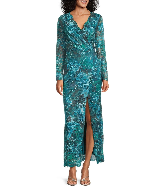 Marina Printed Foil Long Sleeve V-Neck Pleated Dress