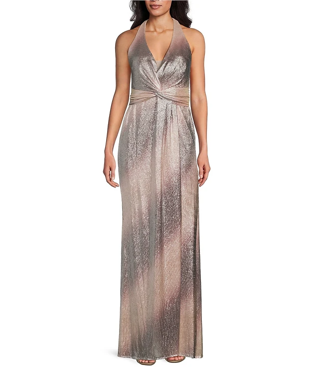 Betsy & Adam Petite Size Metallic Crinkle Foil Mesh Long Sleeve Gown