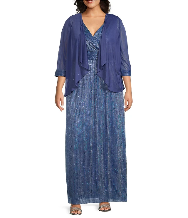 Alex Evenings Glitter Mesh Embellished Ruched Waist 3/4 Sleeve Gown