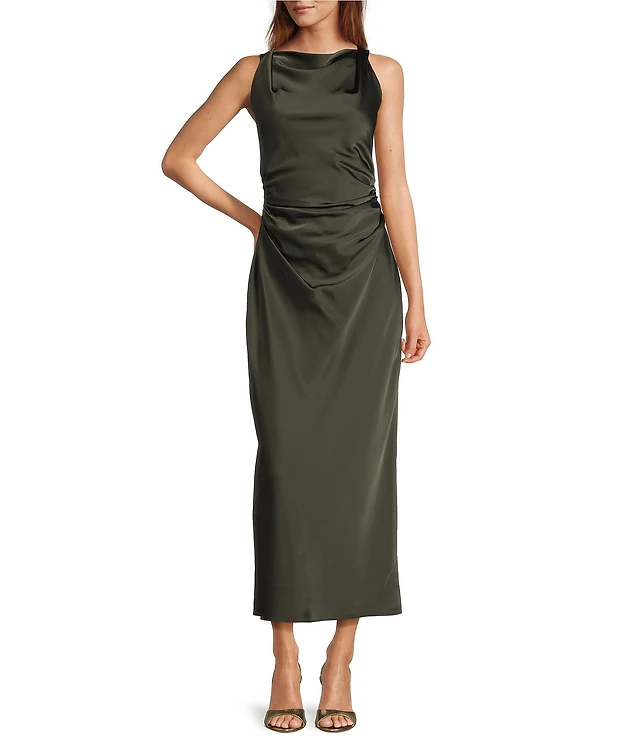 Julia Jordan Satin Knit One Shoulder Rouched Sheath Midi Dress