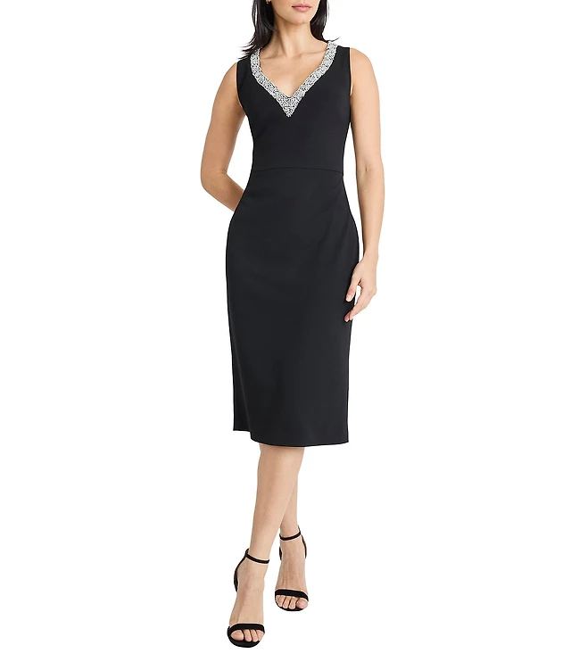 Mac Duggal Sleeveless Crepe Midi Dress With Rhinestone Detail & Side Cut Outs