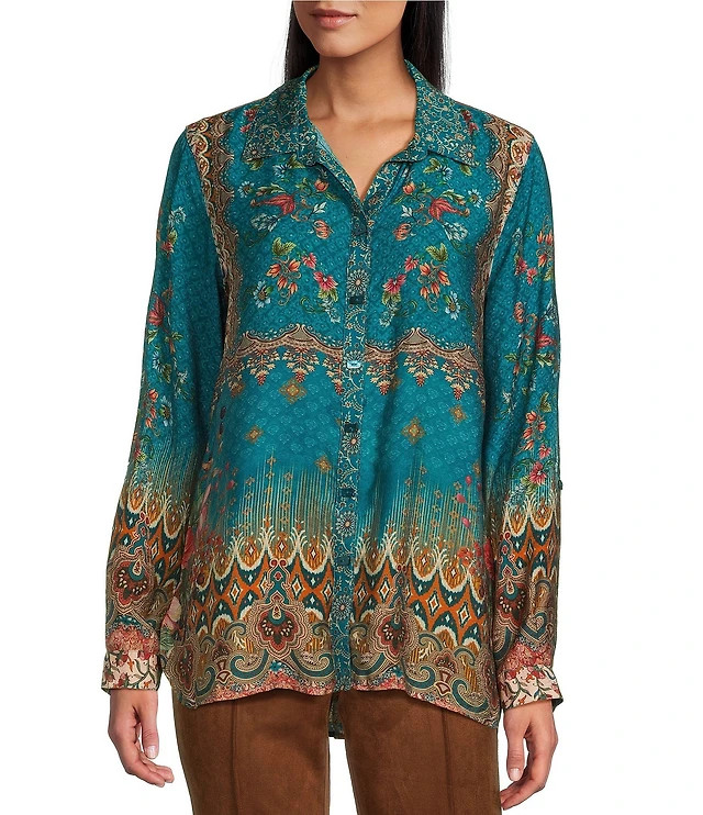 John Mark Printed Point Collar 3/4 Sleeve Button Down Tunic