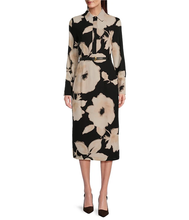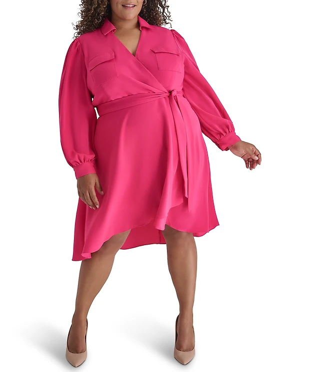 DKNY by Donna Karan Plus Size Collared V-Neck Long Sleeve Tie Waist Shirtdress