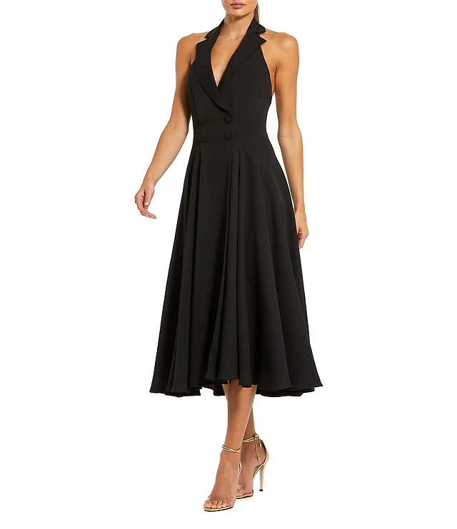 Mac Duggal Crepe Notch Lapel Halter Neck Sleeveless Button Front Blazer Dress