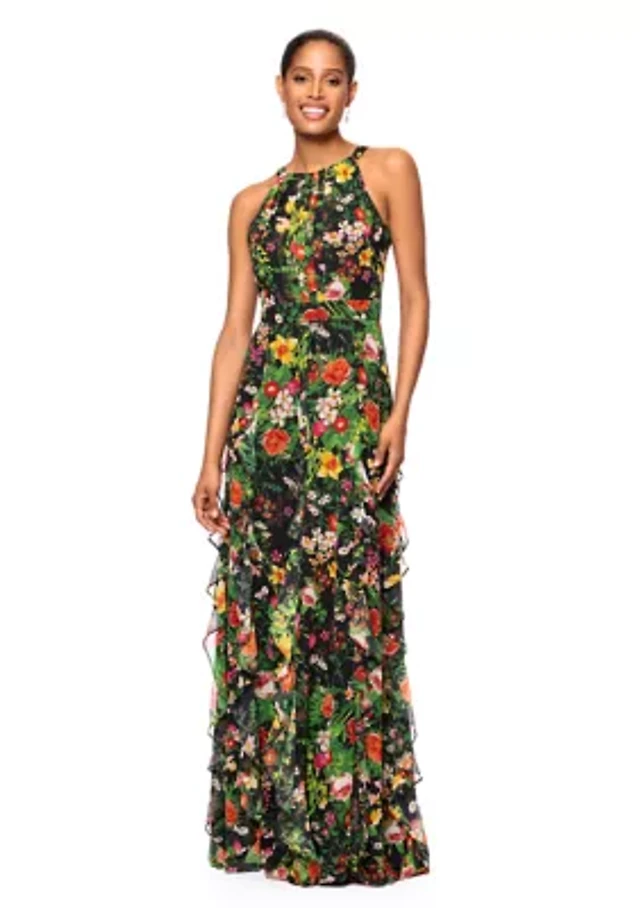 Women's Floral Printed Ruffle Gown